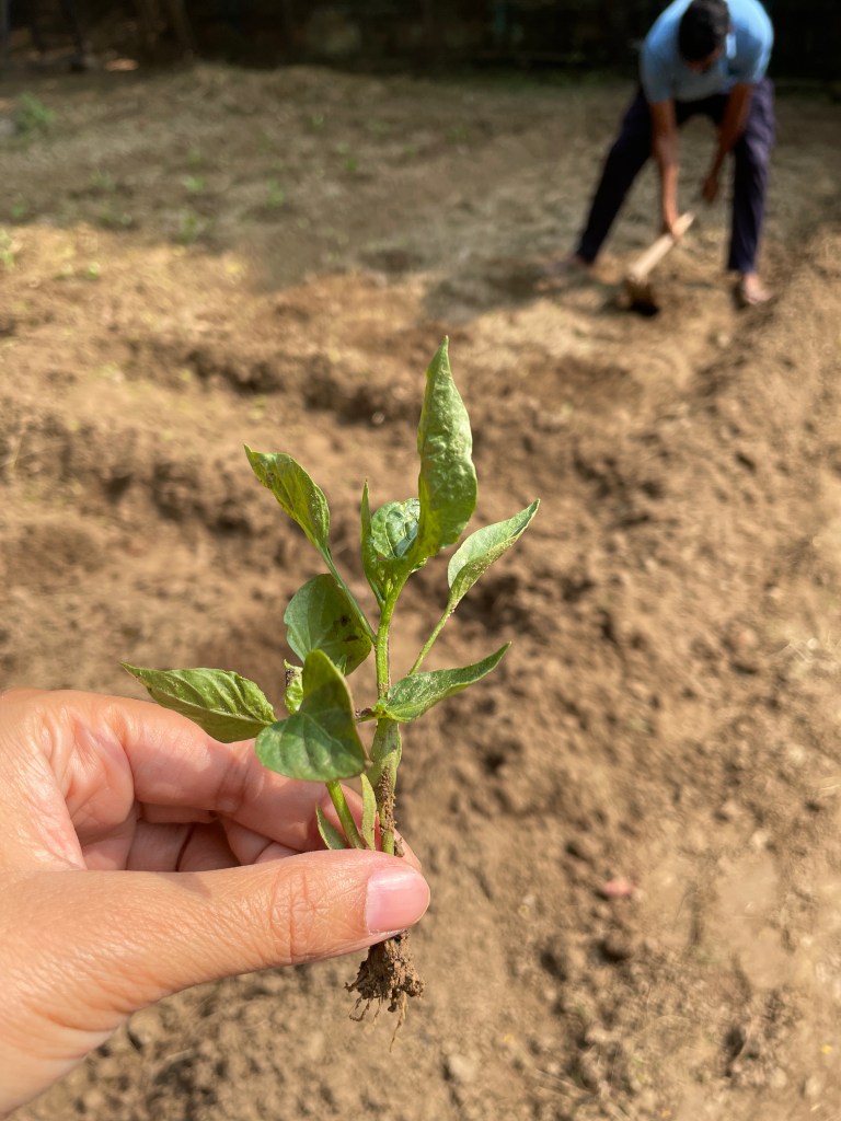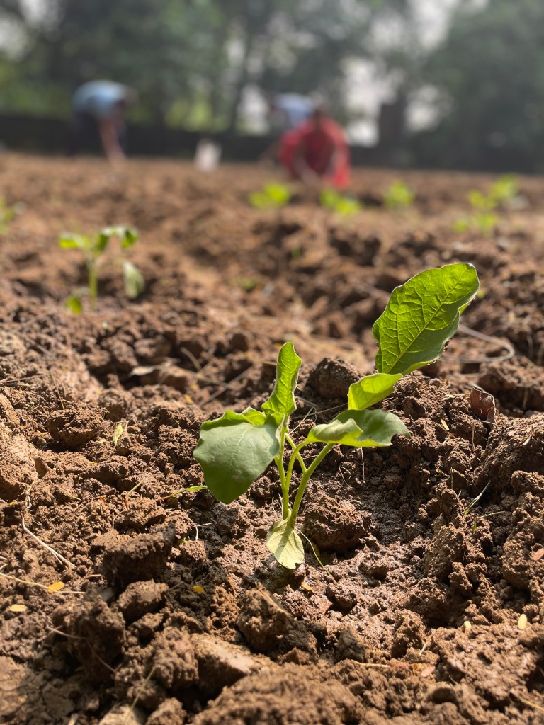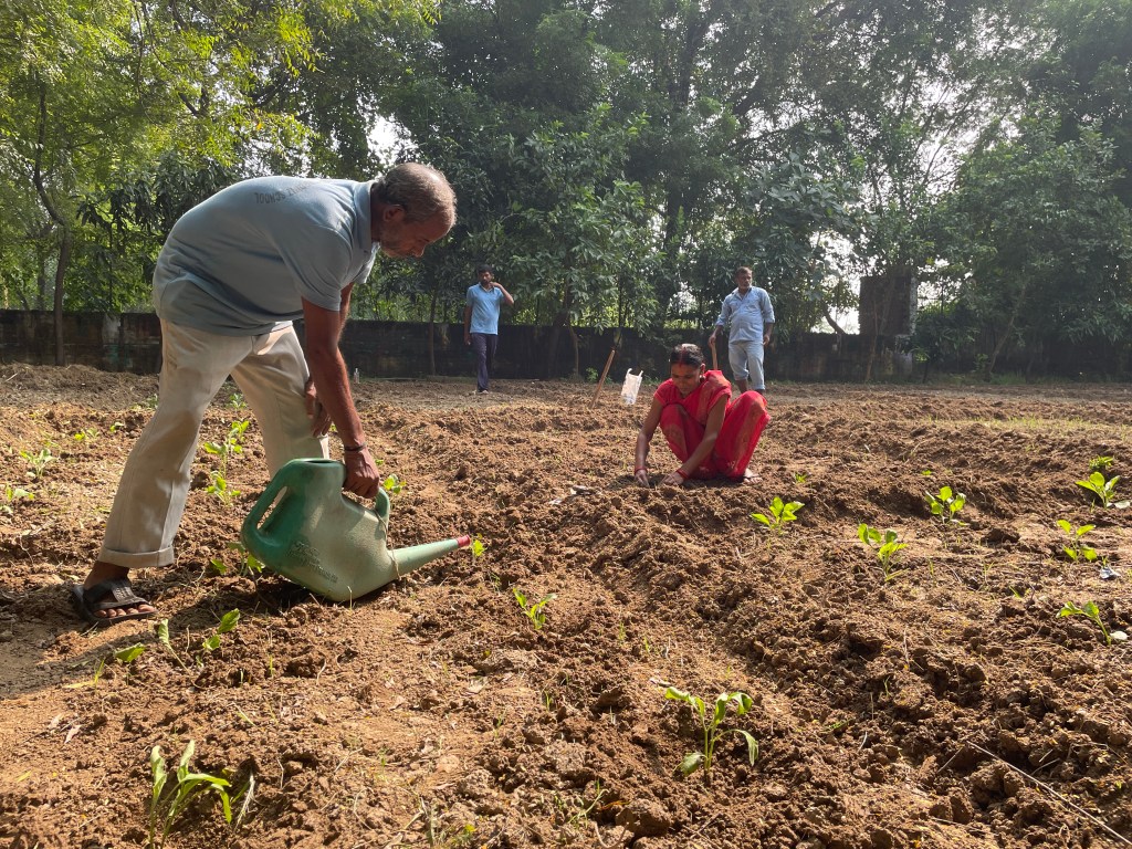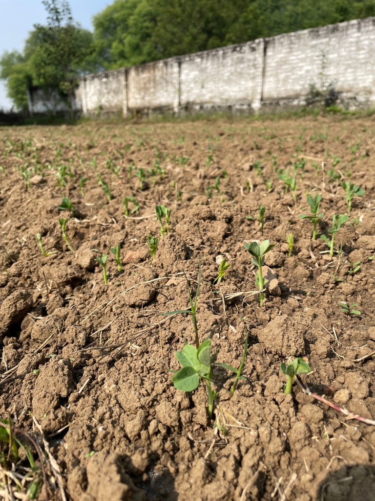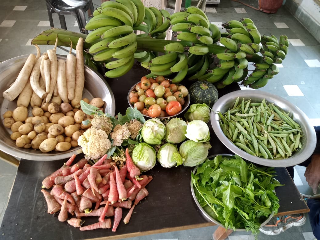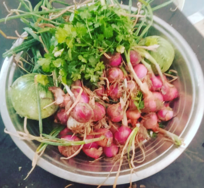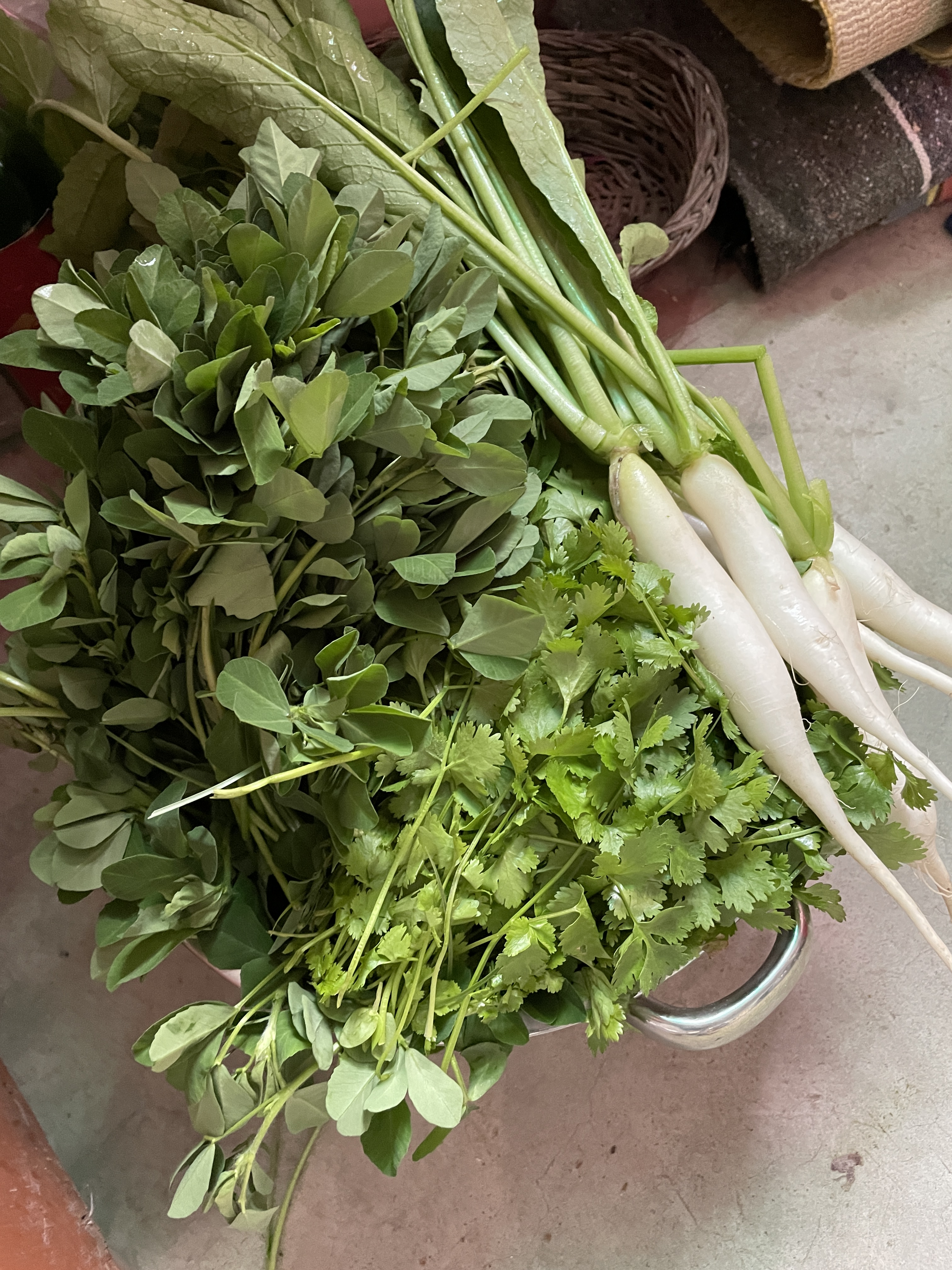 The one thing making the most impact right now is our plentiful harvest. We have a field full of peas….we have already shelled and frozen many kilos. We eat them everyday, in curries, rice dishes, and as a snack. The cauliflowers are enough to feed the campus daily. The carrots and radish are more than we can manage. On certain days there is radish dal for lunch, together with a radish greens curry and a radish salad. No one complains! So tasty is everything. There are basket-loads of spinach and coriander (palak and dhania), fenugreek and dill (soya and methi). I didn’t mention the potatoes: small, succulent, their skins transparent and fresh—real babies.